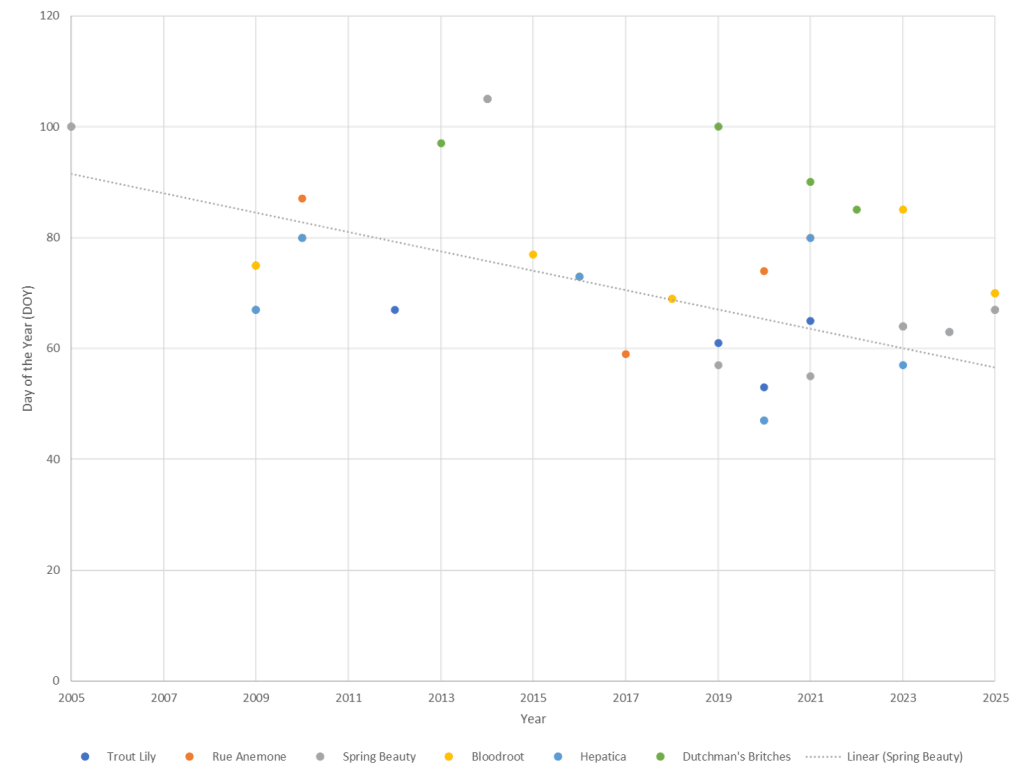 Figure 2. Bloom first bloom dates of spring ephemerals [Bloodroot (Sanguinaria canadensis), Dutchman’s Britches (Dicentra cucullaria), Hepatica (Hepatica sp.), Rue Anemone (AKA Windflower, Thalictrum thalictroides, Anemonella thalictroides), Spring Beauty (Claytonia virginica), and Trout Lily (Erythronium americanum and Erythronium umbillicatum)] in the Piedmont of NC (2005-2025), collected by Nicolette L. Cagle. Includes a trend line for Spring Beauty’s (Claytonia virginica) earliest noted bloom time.