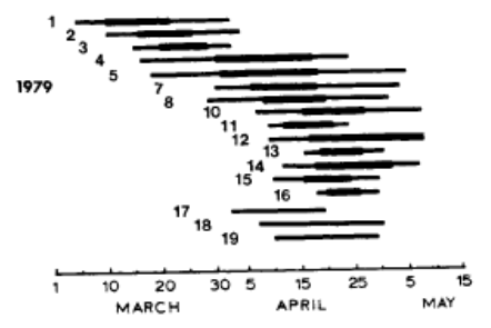 Figure 1. Bloom times for Spring flowers in the Duke Forest in 1979 from Alexander F. Motten, “Pollination Ecology of the Spring Wildflower Community of a Temperate Deciduous Forest,” Ecological Monographs 56, no. 1 (February 1986): 21–42, https://doi.org/10.2307/2937269.
